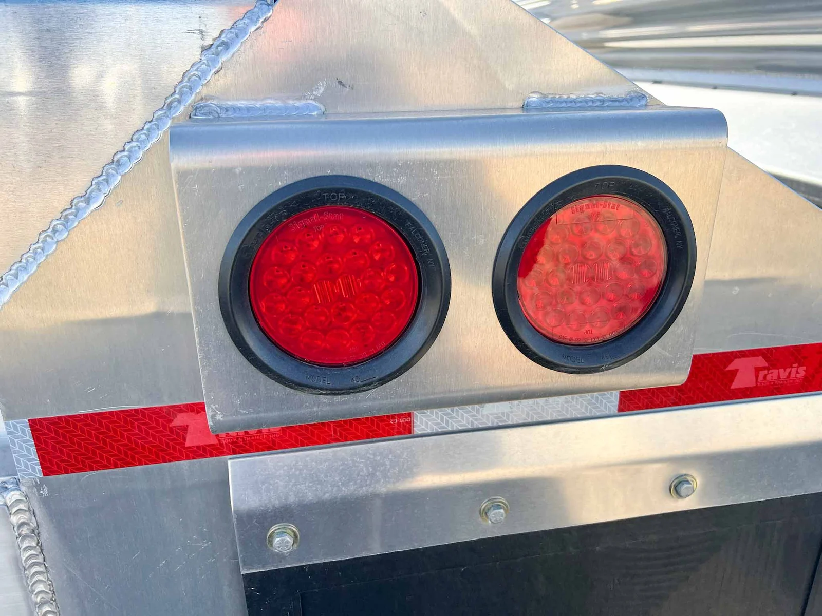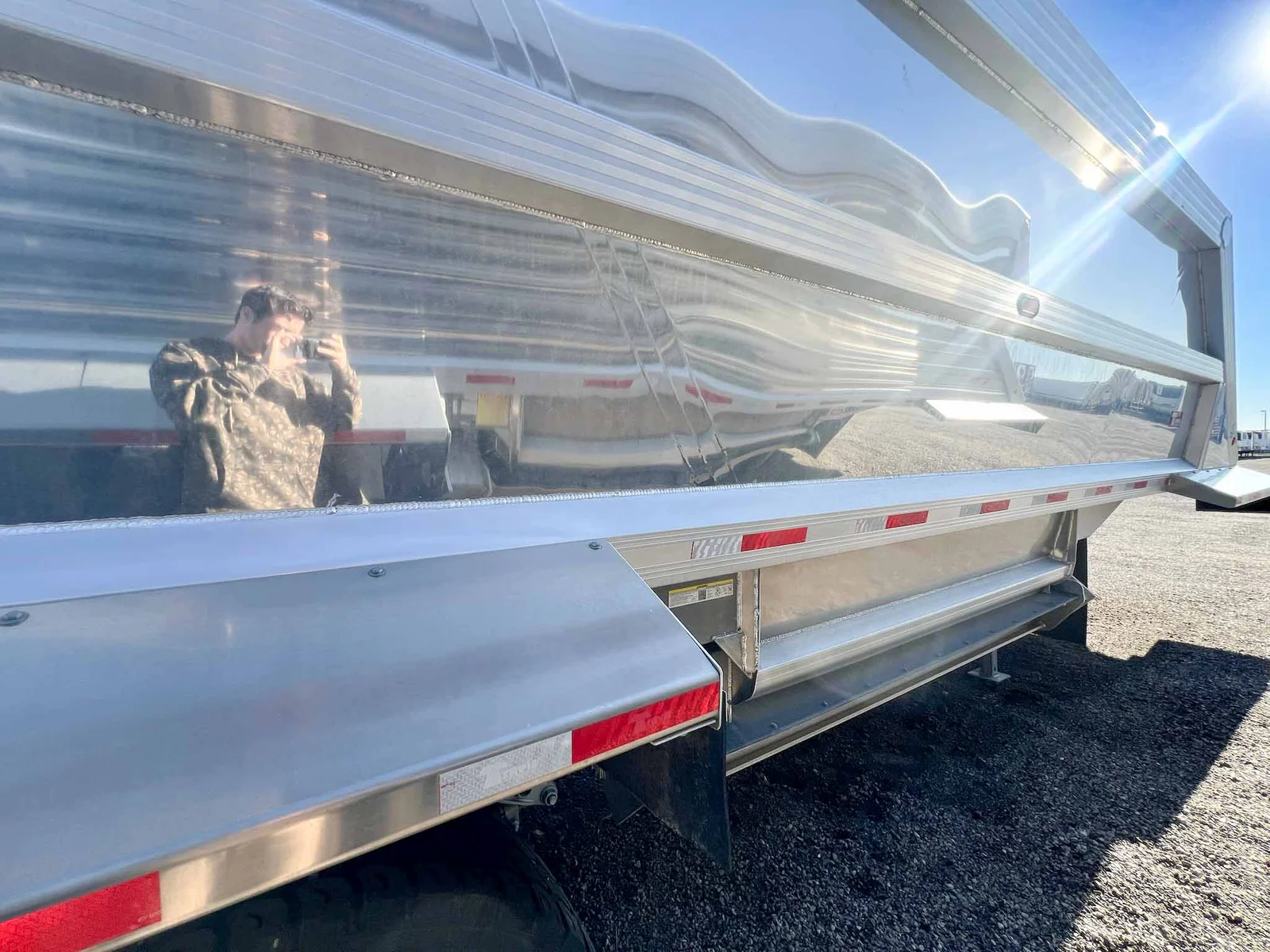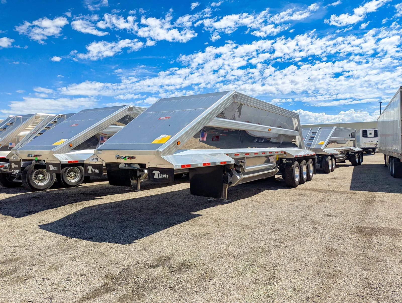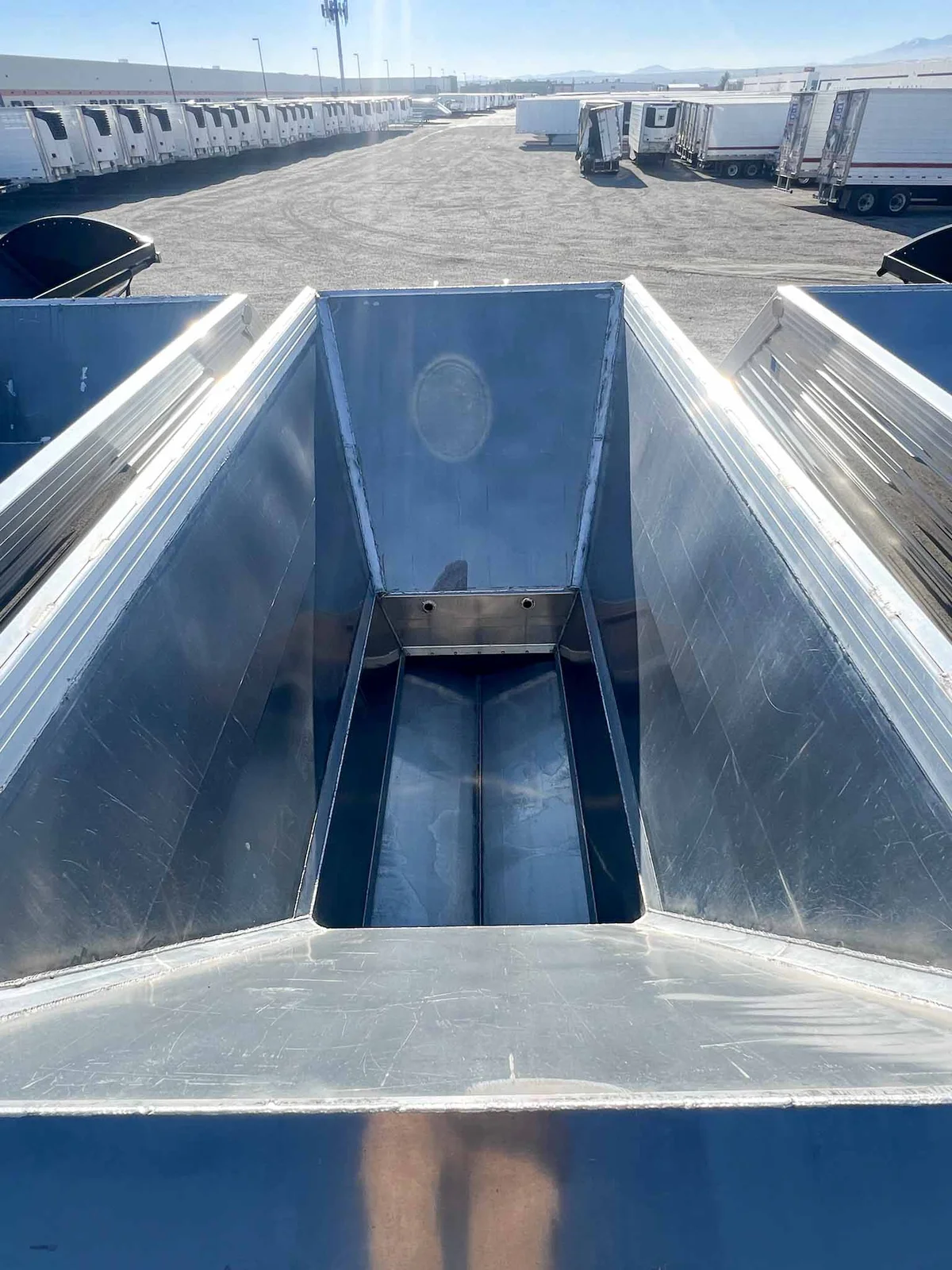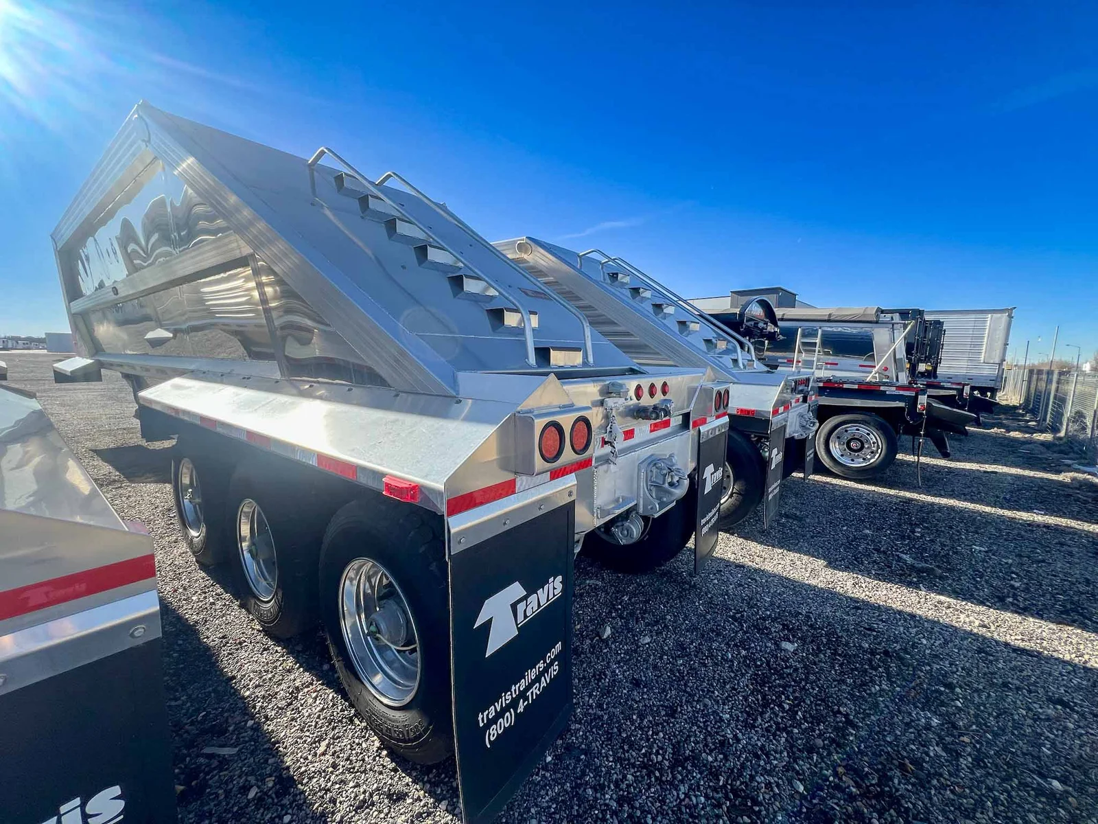 36' aluminum bottom dump trailer with the Travis Aerolite single-wall design and 27 cu. yd. capacity. Built to Geneva Rock spec, it features a fixed spring suspension, air disc brakes, aluminum singles on 385/65R22.5 wheels, and Michelin tires. Includes PSI tire inflation system, electric toggle gates, and pintle hook assembly. Reinforced with aluminum angle on the top rail. Designed as a lead trailer with combined capacity of 49 cu. yds. when paired. No tarp system included. Located in Salt Lake City, UT. Mountain West Utility Trailer offers financing and trailer rentals. Call us at 801-973-4040.