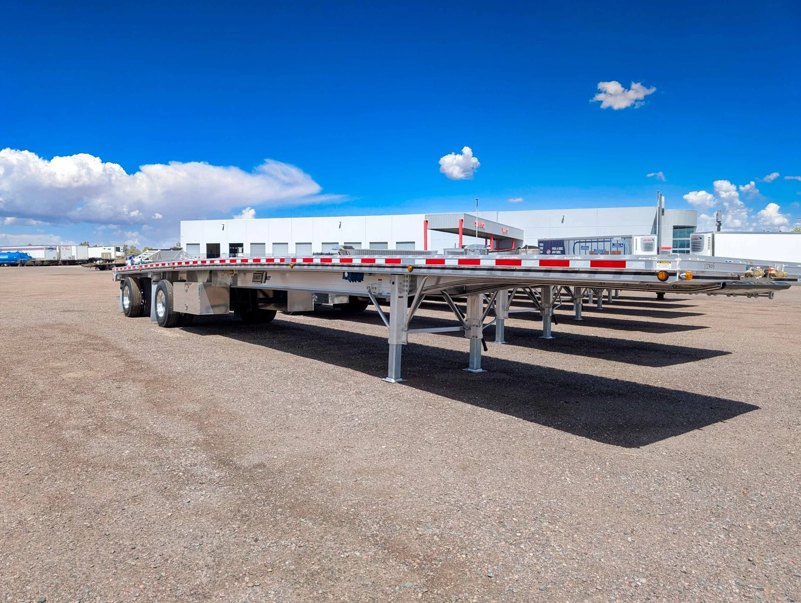 STOCK East Beast II Aluminum Flatbed. (9) LED Lights, 22" Crossmember spacing, 2-nailer, Double L Siderail, (20) total winches, (2) 24 X 24 X 60 aluminum double door toolboxes,Cal-legal slider, front lift-axle, 49" fifthwheel height, Tiremaax pro w/ integral checkport