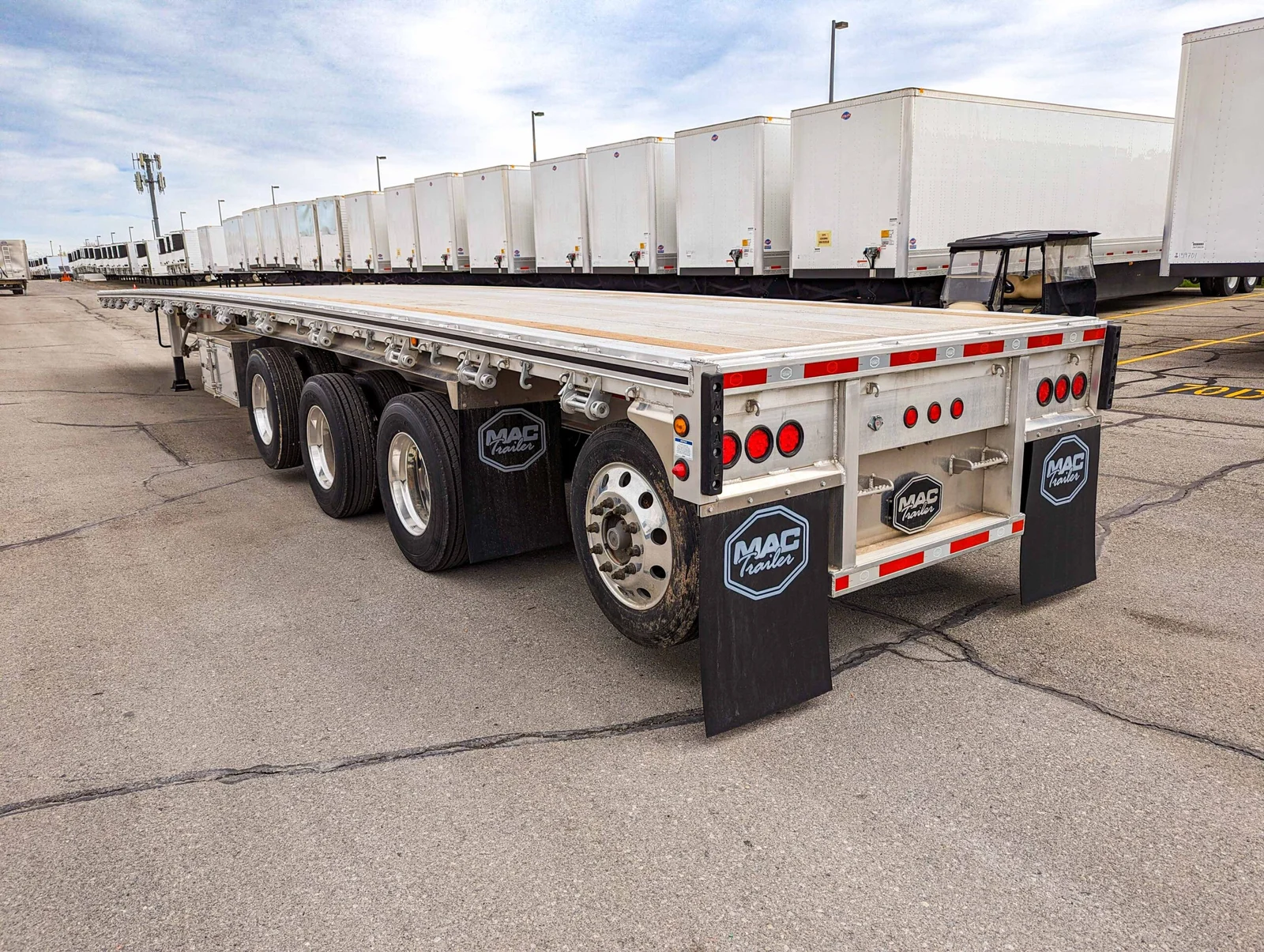 This 2026 flatbed trailer is equipped with drum brakes, aluminum construction, Hendrickson INTRAAX ANT-23K air ride suspension, and a 4-axle configuration with a lift front axle and steerable rear axle. The quad axle design and dual winch tracks support heavy and specialized freight.\n\n• 2026 MAC MAC-FLAT\n• 53' Overall Length\n• Aluminum Composition\n• 4 Axles\n• Axle #1 Lift\n• Axle #2 Fixed\n• Axle #3 Fixed\n• Axle #4 Steerable Lift\n• Hendrickson INTRAAX ANT-23K Air Ride Suspension\n• Fixed Suspension Style\n• Aluminum Wheels\n• Sliding Double L Winch Track Both Sides\n• 20 Sliding Galvanized Winches\n• Rope Hooks Spaced Every 2'\n• Reverse-A-Matic with Ball Valve and Regulator\n• Axle Spacing 61", 61", 76"\n• 295/75R22.5 General RA 16 Ply Tires Duals\n• 255/70R22.5 General HT+ 16 Ply Tire Single\n• 24x24x60 Double Door Aluminum Toolbox\n• 4 Way Auxiliary Front and Rear\n• LED Lighting Package\n• Drum Brakes\n\nThis trailer is available now at our Boise, Idaho location. Mountain West Utility Trailer offers financing and trailer rentals. Call us at (208) 336-0138.