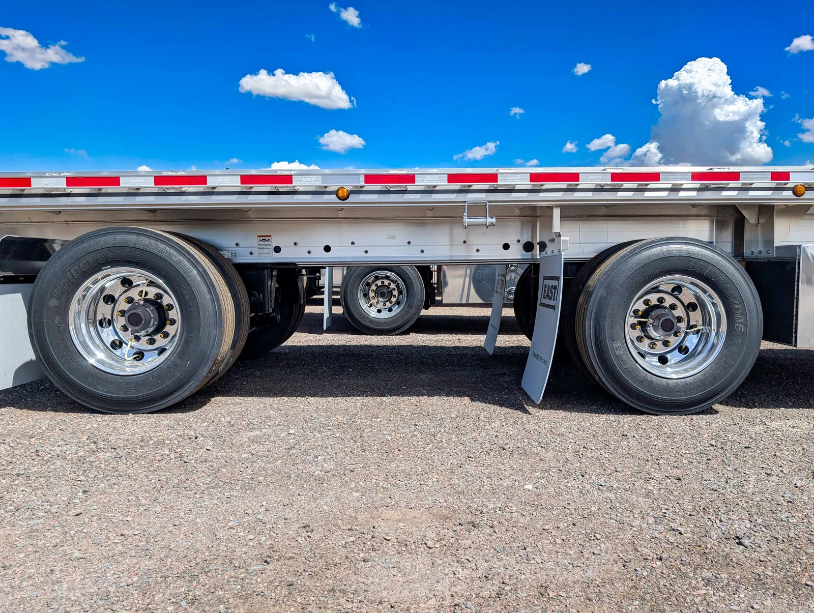 STOCK East Beast II Aluminum Flatbed. (9) LED Lights, 22" Crossmember spacing, 2-nailer, Double L Siderail, (20) total winches, (2) 24 X 24 X 60 aluminum double door toolboxes,Cal-legal slider, front lift-axle, 49" fifthwheel height, Tiremaax pro w/ integral checkport
