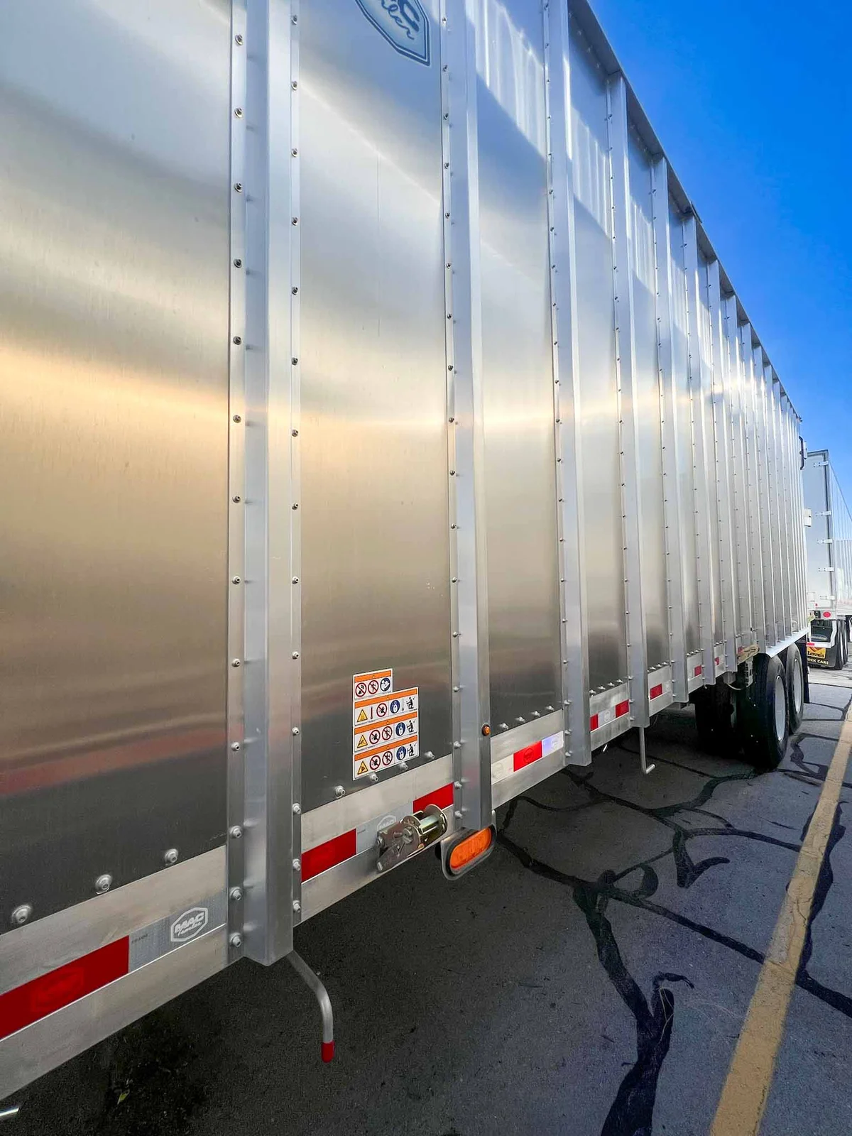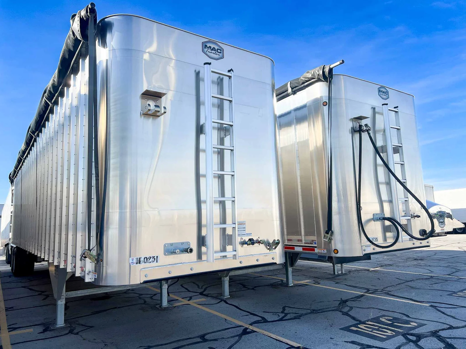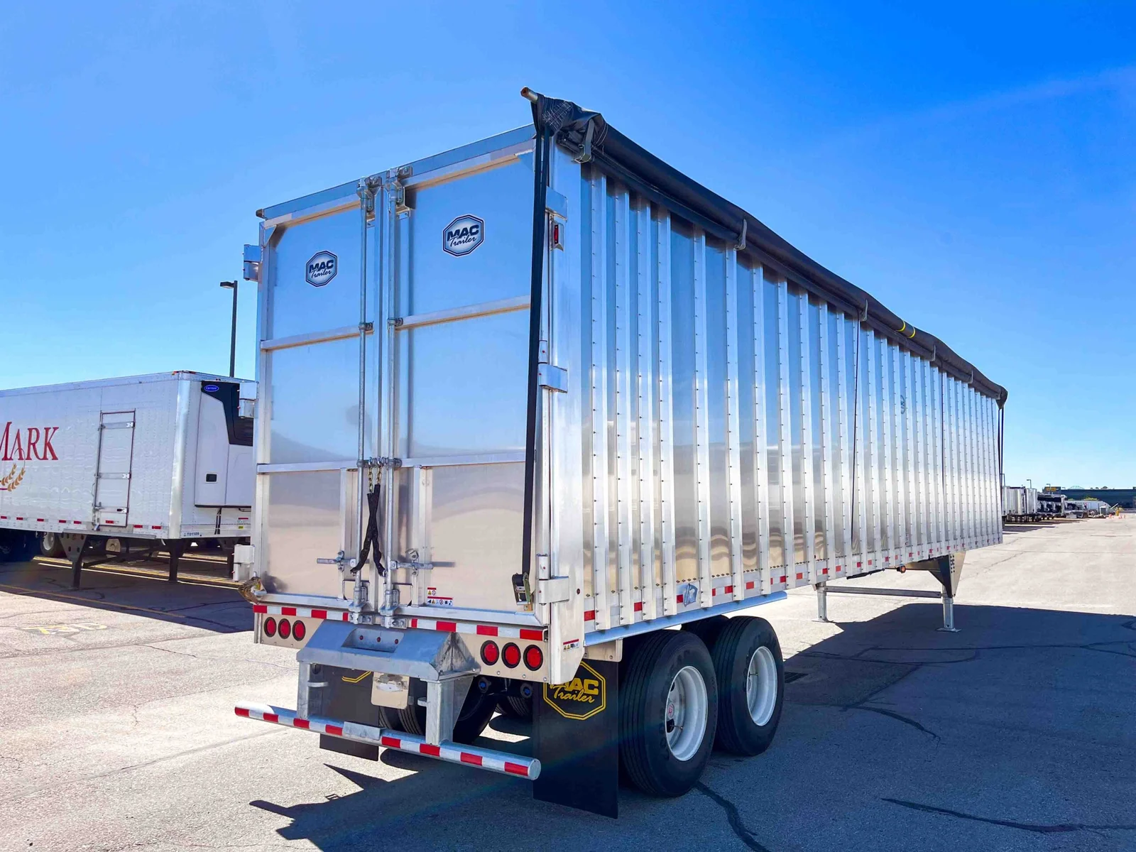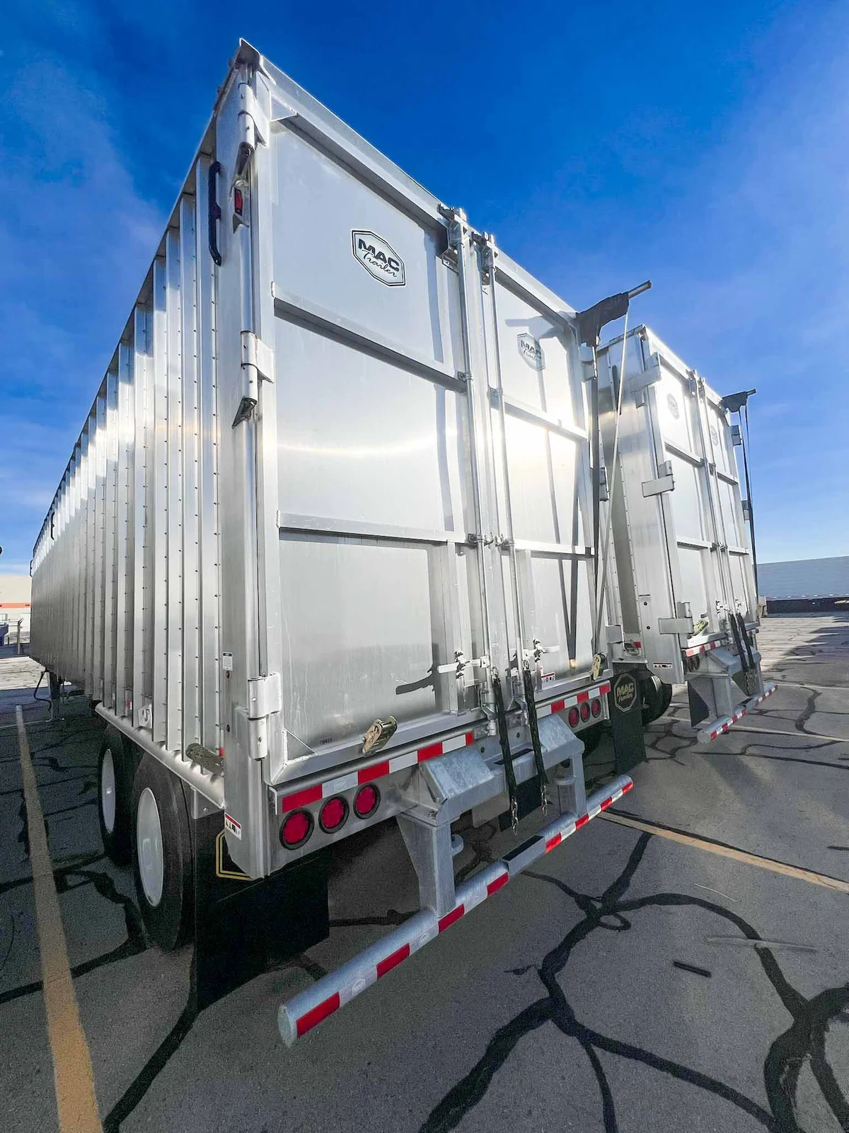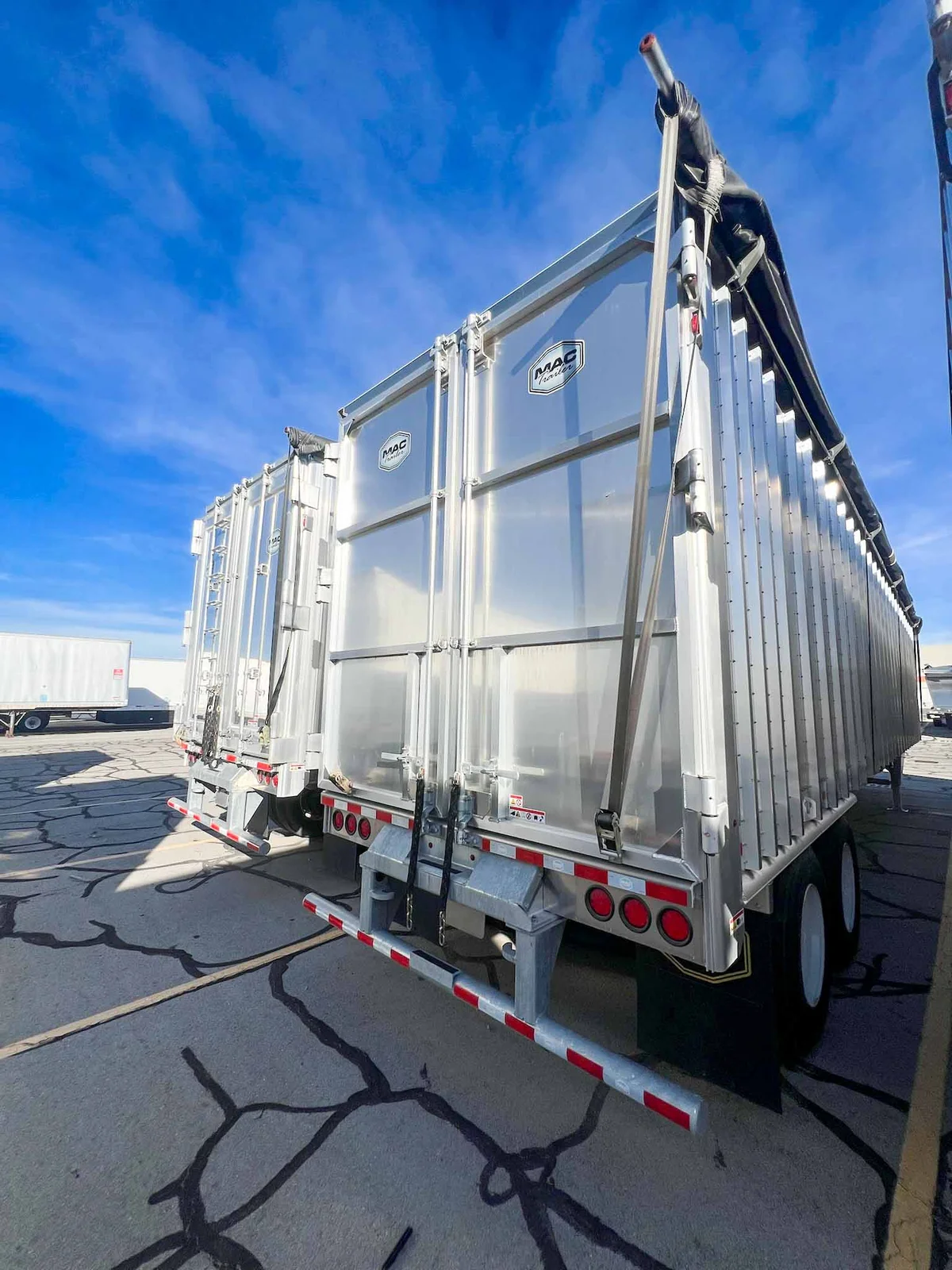 MW Trailer description said:\n\nThis new 2026 MAC transfer trailer is engineered for high-volume refuse or chipper applications. Located in Salt Lake City, it offers a 128-cubic yard capacity with heavy-duty specs, including a KEITH triple ridge floor and Hendrickson air ride suspension.\n\nKey Specs:\n\n48' Length\n\n102" Width\n\n13'6" Overall Height\n\n128 Cubic Yard Capacity\n\nAluminum Composition\n\nHendrickson Air Ride Suspension\n\nTandem Axle\n\nKEITH #2299 ½” Triple Ridge Floor – 25 Slats, 3" Drive Units\n\nManual Strap & Ratchet Mesh Tarp\n\nSheet & Post Design\n\nRight Weigh Load Scale\n\nStep Ladder at Front\n\nDouble Swing Barn Doors\n\nGalvanized Rear Bumper Assembly\n\nSafety Chains\n\n11R22.5 Goodyear Tires\n\nSteel Wheels\n\nApprox. Weight: 15,410 lbs ±3%\n\nFET Included\n\nMountain West Utility Trailer offers financing and trailer rentals. Call us at 801-973-4040.