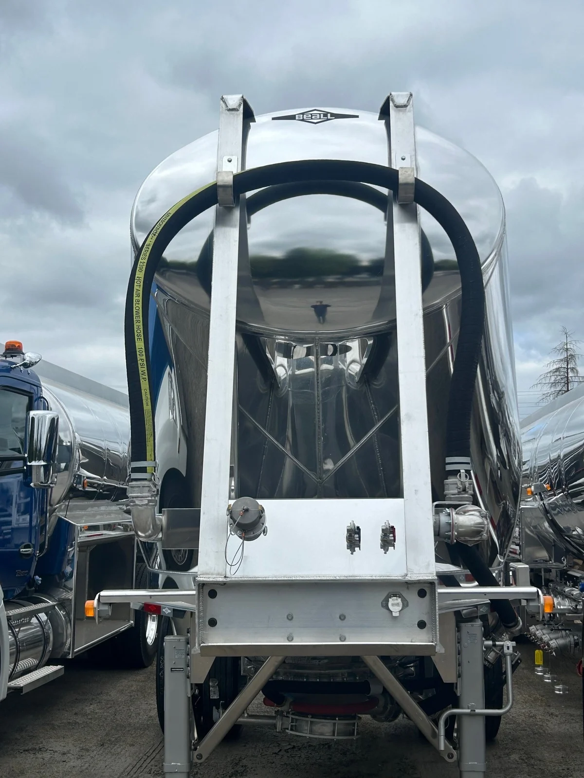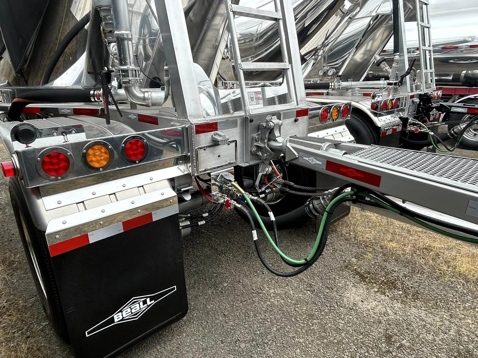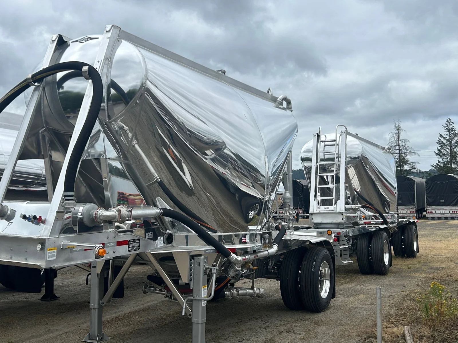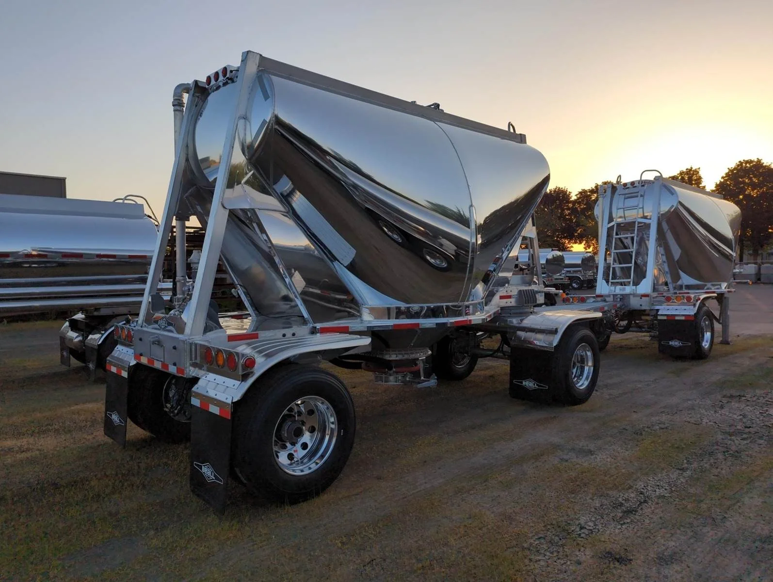 2026 BEALL 550 DRY BULK 3-AXLE SET\n\nProduct Details: \n\n1-Axle Lead Trailer\n550 Cubic Feet, Aluminum Construction, 102"W, States of Operation: California, Nevada & Arizona, Aeration - (3) Flow Cones, 3" Silencer installed downstream on street side inlet, 2" Check Valve (No Top Air), 5" x 4" Aluminum Y-Branch w/ 5" Butterfly Valve angled 45 degrees to street side rear, Terminate w/ 4" female Coupler & Plug, Single Axle, Hutch 9700 Spring Ride Suspension, Hendrickson P-Spindle Axle, Hendrickson MAXX22T Air Disc Brakes, Hendrickson Tiremaxx PRO Tire Inflation, 11R22.5 Michelin X-Line Energy T2 Tires, Aluminum Wheels, (2) Ribbed Aluminum Fenders, JOST Two-Speed Landing Gear, Pintle Hitch Assy., Truck-Lite LED Lighting.\n\n2-Axle Pup Trailer\n550 Cubic Feet, Aluminum Construction, 102"W, States of Operation: California, Nevada & Arizona, Aeration - (3) Flow Cones, 2" Check Valve (No Top Air), 5" x 4" Aluminum Y-Branch w/ 5" Butterfly Valve angled 45 degrees to street side front, Terminate w/ 4" female Coupler & Plug, Single Axle, Turntable Dolly, Double Ball Bearing Turntable, Hutch 9700 Spring Ride Suspension, Hendrickson P-Spindle Axle, Hendrickson MAXX22T Air Disc Brakes, Hendrickson Tiremaxx PRO Tire Inflation, 11R22.5 Michelin X-Line Energy T2 Tires, Aluminum Wheels, (4) Ribbed Aluminum Fenders, Truck-Lite LED Lighting.\n\nOverall Length for set - 48'