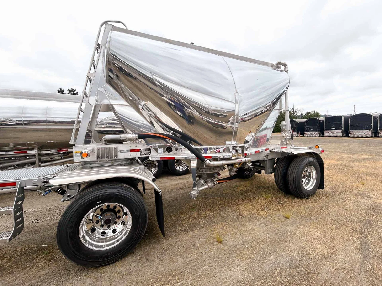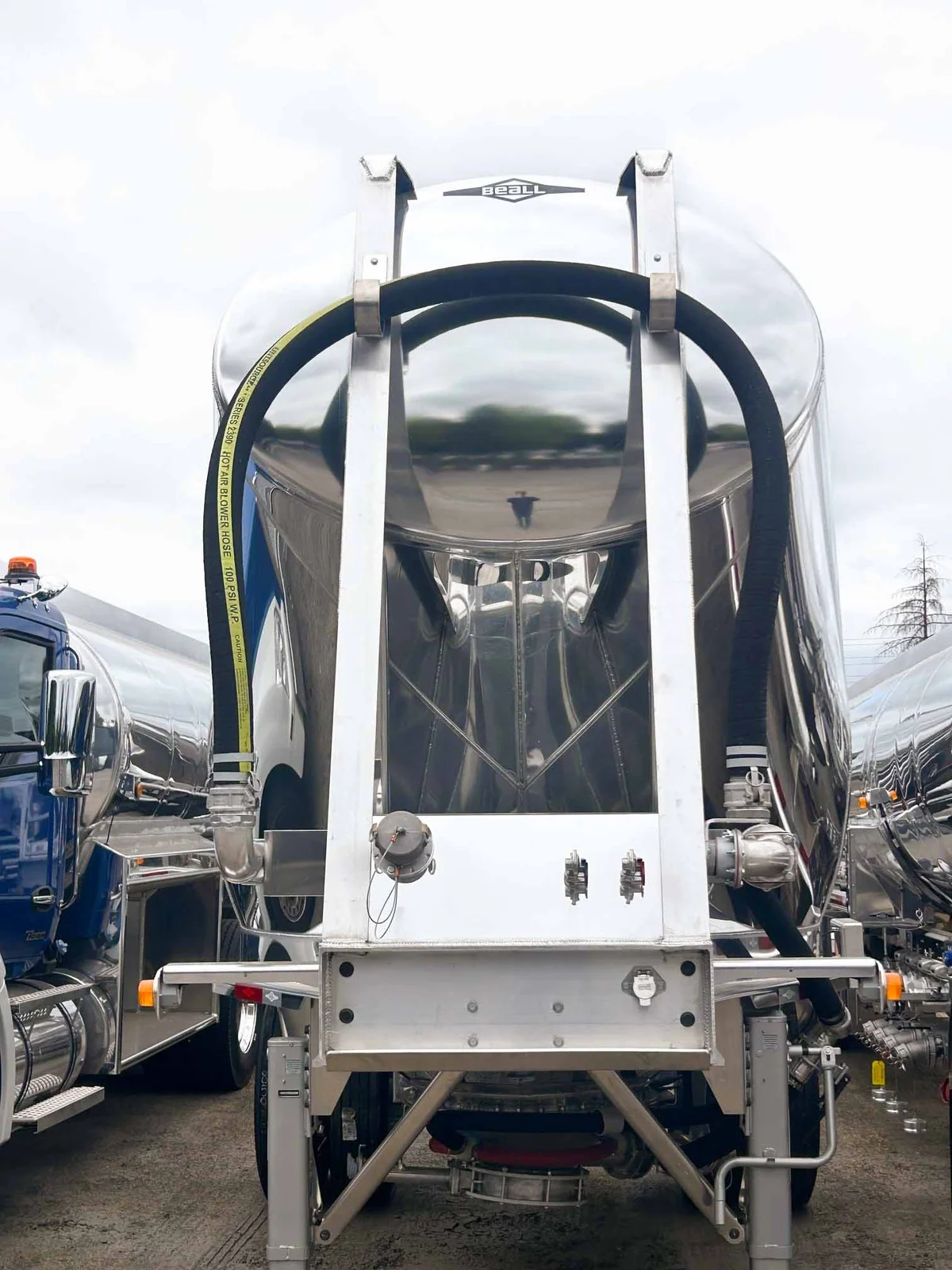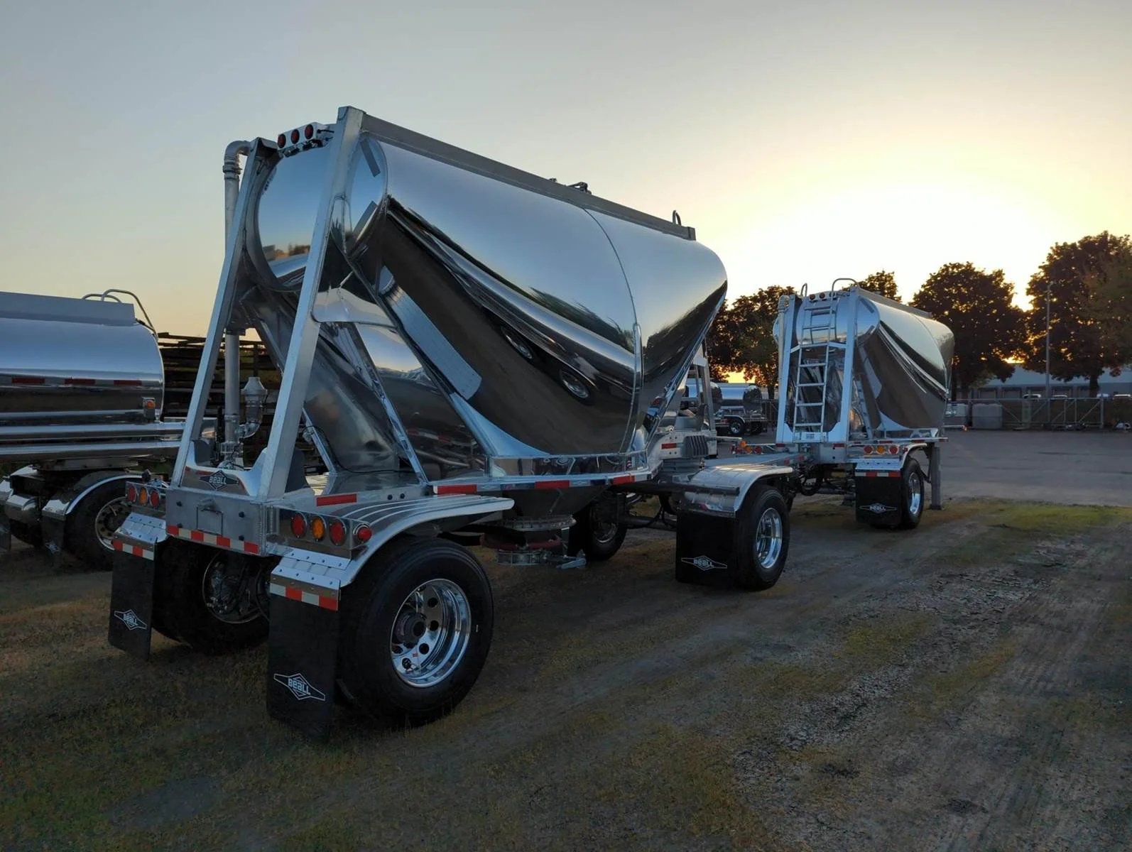2026 BEALL 550 DRY BULK 3-AXLE SET\n\nProduct Details: \n\n1-Axle Lead Trailer\n550 Cubic Feet, Aluminum Construction, 102"W, States of Operation: California, Nevada & Arizona, Aeration - (3) Flow Cones, 3" Silencer installed downstream on street side inlet, 2" Check Valve (No Top Air), 5" x 4" Aluminum Y-Branch w/ 5" Butterfly Valve angled 45 degrees to street side rear, Terminate w/ 4" female Coupler & Plug, Single Axle, Hutch 9700 Spring Ride Suspension, Hendrickson P-Spindle Axle, Hendrickson MAXX22T Air Disc Brakes, Hendrickson Tiremaxx PRO Tire Inflation, 11R22.5 Michelin X-Line Energy T2 Tires, Aluminum Wheels, (2) Ribbed Aluminum Fenders, JOST Two-Speed Landing Gear, Pintle Hitch Assy., Truck-Lite LED Lighting.\n\n2-Axle Pup Trailer\n550 Cubic Feet, Aluminum Construction, 102"W, States of Operation: California, Nevada & Arizona, Aeration - (3) Flow Cones, 2" Check Valve (No Top Air), 5" x 4" Aluminum Y-Branch w/ 5" Butterfly Valve angled 45 degrees to street side front, Terminate w/ 4" female Coupler & Plug, Single Axle, Turntable Dolly, Double Ball Bearing Turntable, Hutch 9700 Spring Ride Suspension, Hendrickson P-Spindle Axle, Hendrickson MAXX22T Air Disc Brakes, Hendrickson Tiremaxx PRO Tire Inflation, 11R22.5 Michelin X-Line Energy T2 Tires, Aluminum Wheels, (4) Ribbed Aluminum Fenders, Truck-Lite LED Lighting.\n\nOverall Length for set - 48'