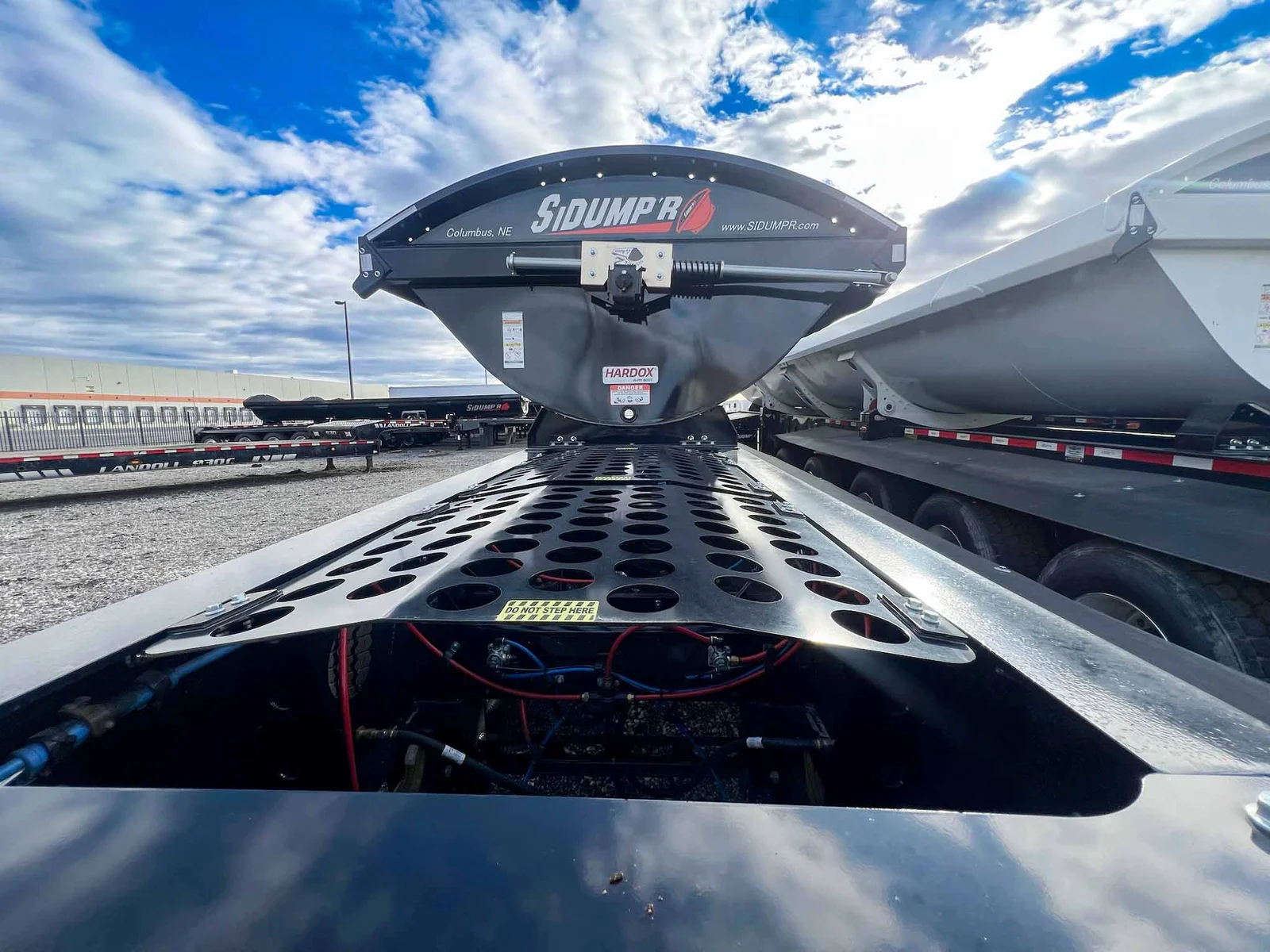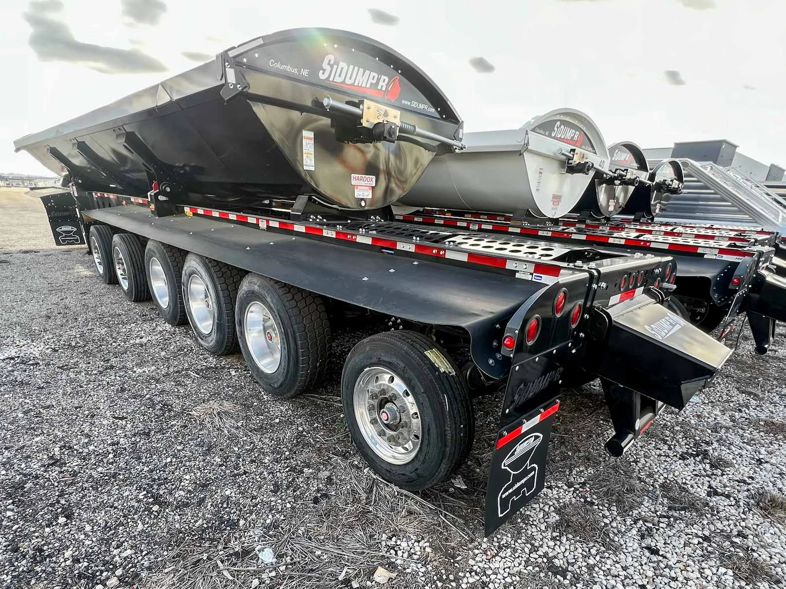6-axle side dump semi-trailer engineered for heavy payload control. Air-ride suspension with steerable lift axles on #1, #2 & #6; #3–#5 fixed for tracking and stability. 53' overall with a 40' 3/16" HARDOX 500TUF steel tub for abrasion resistance. Aluminum single wheels. Aero Sidekick 2 electric tarp with safety switch. Two-speed landing gear, rock guard, bolt-on push block, and fender belting for jobsite protection. Equipped with drum brakes.\nMountain West Utility Trailer offers financing and trailer rentals. Call us at 801-973-4040.