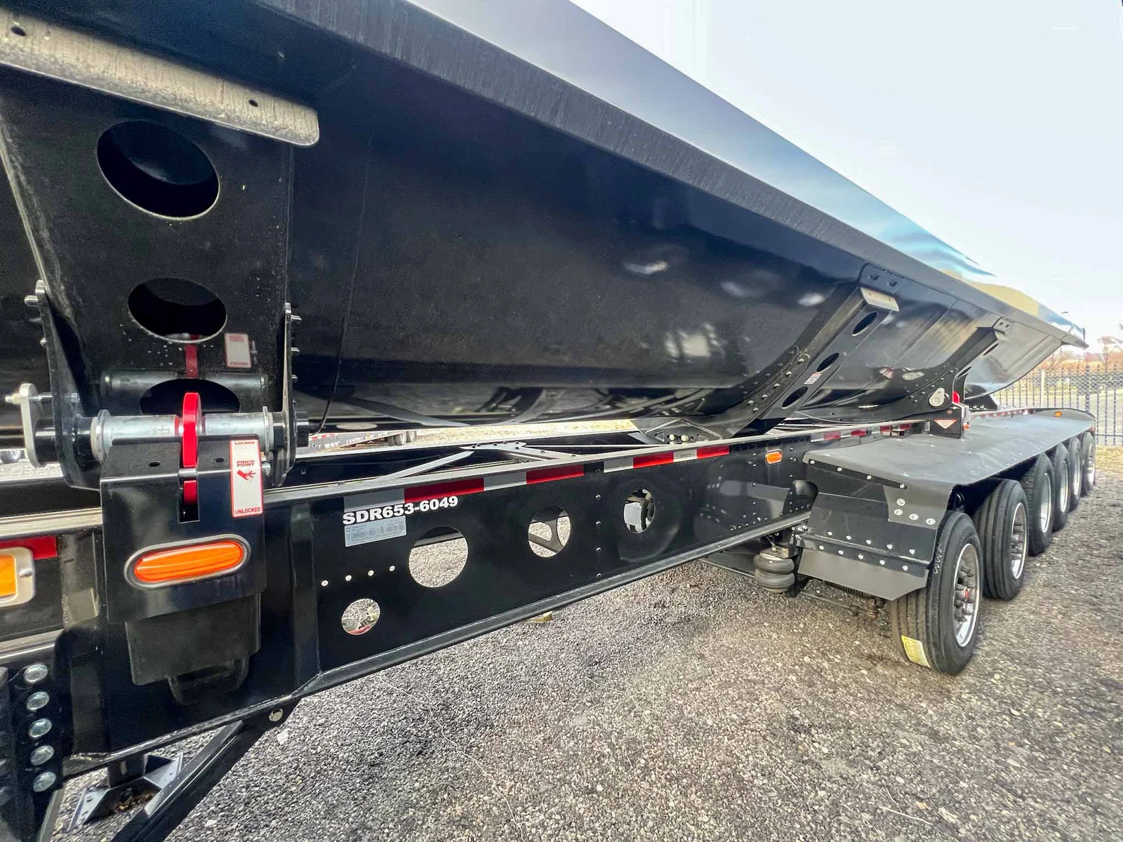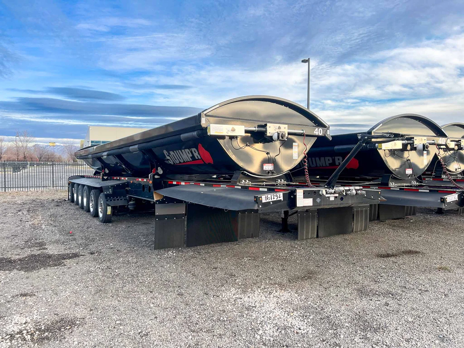 6-axle side dump semi-trailer engineered for heavy payload control. Air-ride suspension with steerable lift axles on #1, #2 & #6; #3–#5 fixed for tracking and stability. 53' overall with a 40' 3/16" HARDOX 500TUF steel tub for abrasion resistance. Aluminum single wheels. Aero Sidekick 2 electric tarp with safety switch. Two-speed landing gear, rock guard, bolt-on push block, and fender belting for jobsite protection. Equipped with drum brakes.\nMountain West Utility Trailer offers financing and trailer rentals. Call us at 801-973-4040.